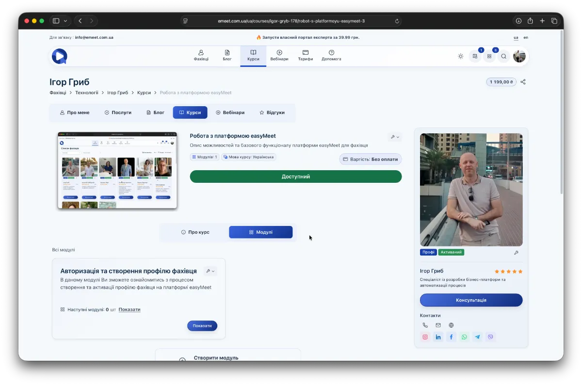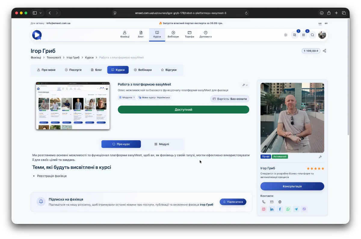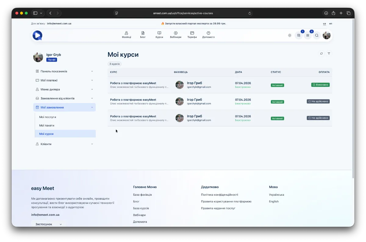 Тут відображаються всі курси, які ви оплатили. Крім того, оплачені вами курси у загальному довіднику курсів чи у розділі Курси у окремого фахівця мають відмітку Доступний. Також цю відмітку мають і безкоштовні курси.