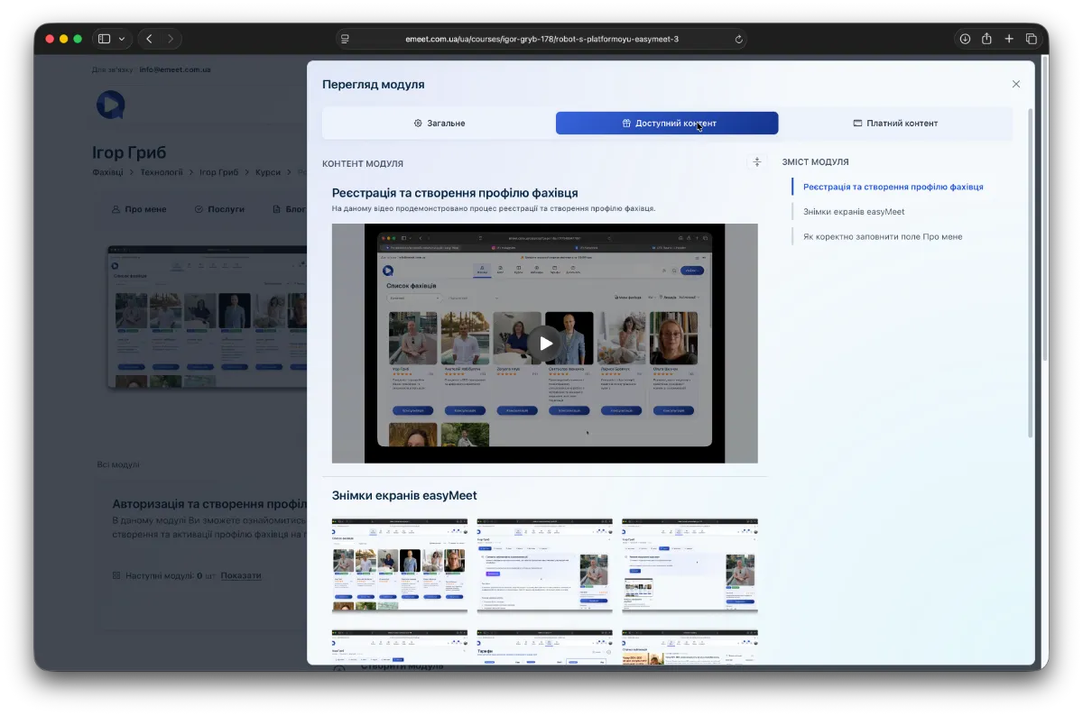 Всі курси складаються з модулів. Модулі містять два типи контенту - Доступний та Платний. Доступний контент доступний для ознайомлення навіть без оплати курсу, відповідно Платний контент доступний після оплати курсу.