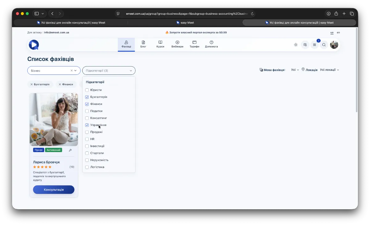 Ви можете обрати одну з категорій, доступних в easyMeet — Бізнес, Маркетинг, Психологія, Освіта, Краса та здоров'я. Також можна звузити вибір до підкатегорій у відповідному фільтрі. Введіть ім'я потрібного фахівця, щоб зайти в його профіль.