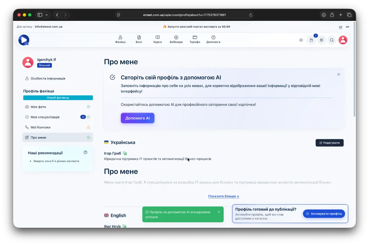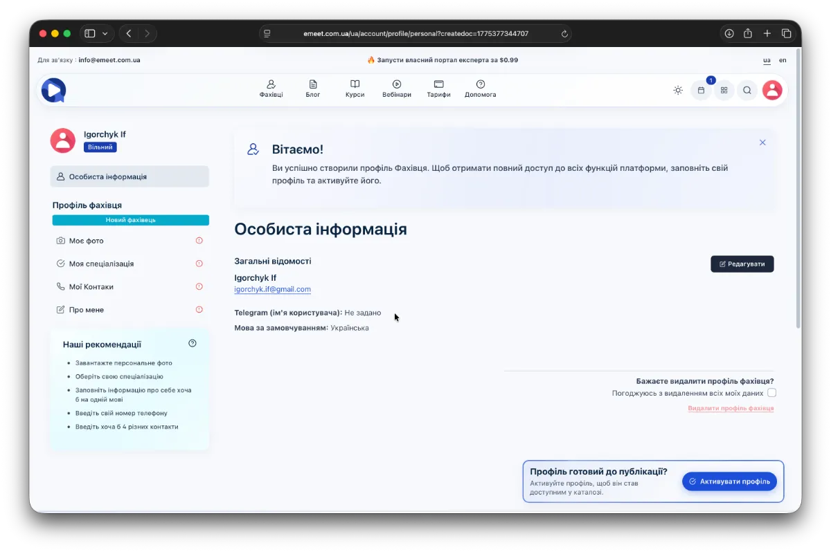 Ви отримаєте привітальне сповіщення про успішно створений профіль фахівця, проте для активації та потрапляння до списку фахівців платформи необхідно заповнити дані про себе, свою діяльність та експертність, а потім активувати профіль.