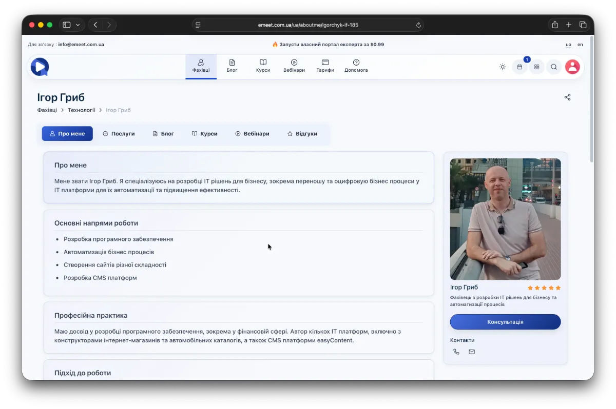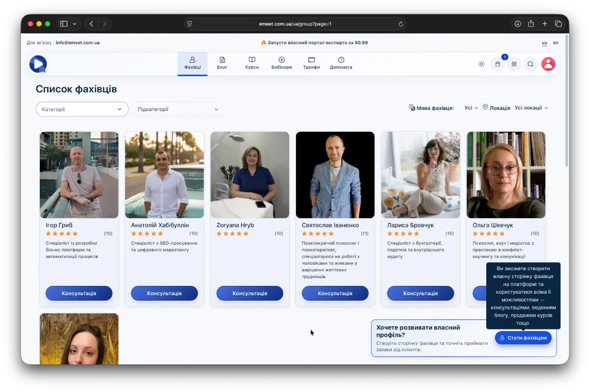 Щоб створити профіль фахівця та використовувати платформу як експерт, мати можливість презентувати свою експертизу онлайн і отримувати дохід від своїх послуг і курсів, вам потрібно авторизуватись, створити профіль фахівця та активувати його.