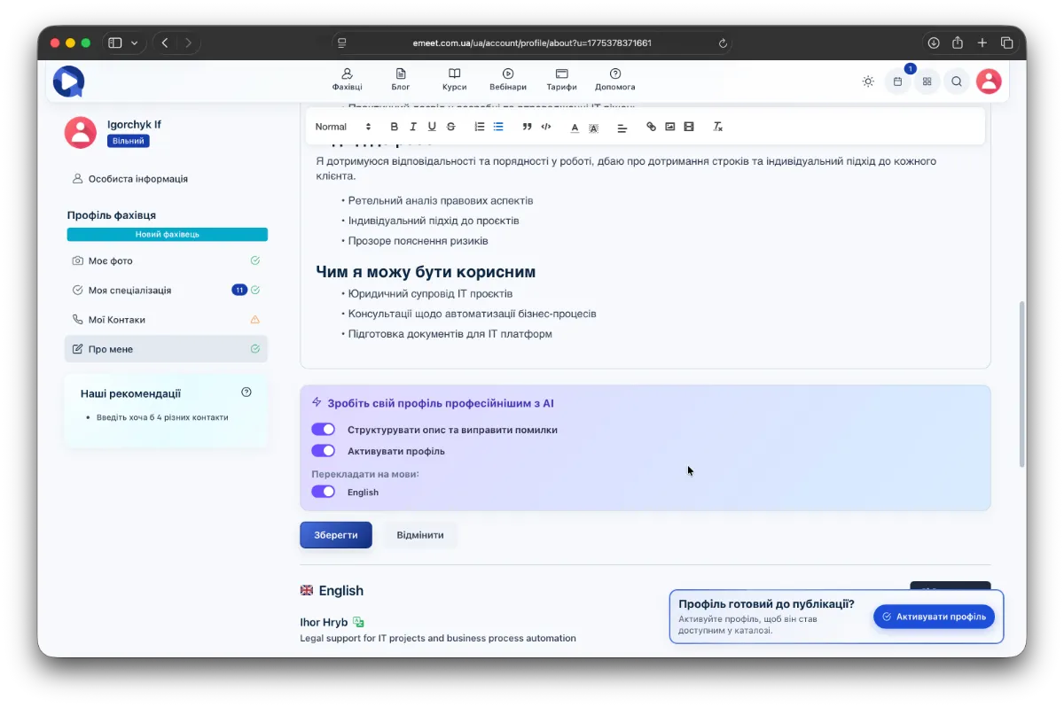 Щоб ваш профіль відображався у списку доступних фахівців, потрібно активувати профіль. Якщо активована опція Активувати профіль, ваш профіль буде надіслано на активацію автоматично після збереження інформації про вас (або після збереження потрібно натиснути кнопку Активувати профіль).
