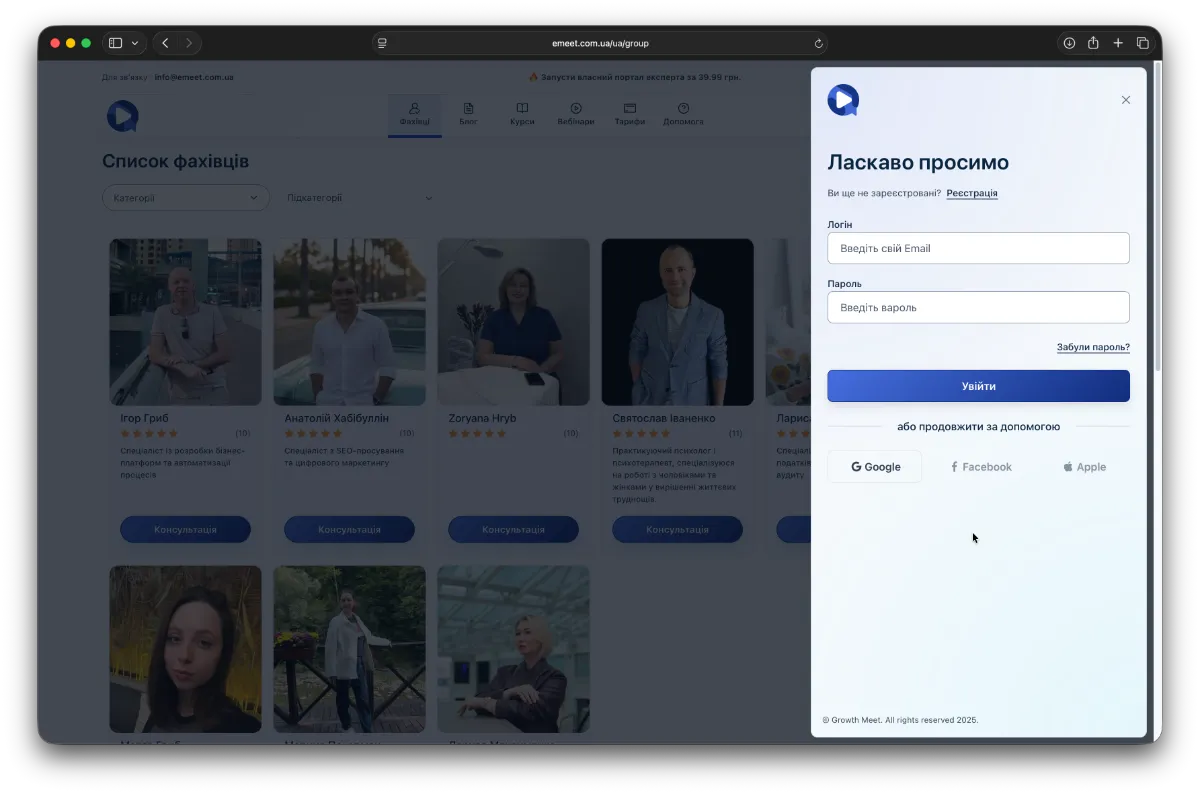- Автоматична реєстрація через авторизацію Google (ми рекомендуємо саме так реєструватись або в подальшому авторизовуватись на easyMeet). Натисніть Увійти в правому верхньому кутку та оберіть або Увійти, або Реєстрація і внизу у розділі "або продовжити за допомогою" скористайтесь Google авторизацією, натиснувши на кнопку Google та авторизуйтесь за допомогою свого облікового запису Google.
