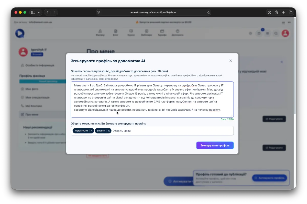 Оберіть мови для генерації опису та натисніть кнопку Згенерувати профіль.