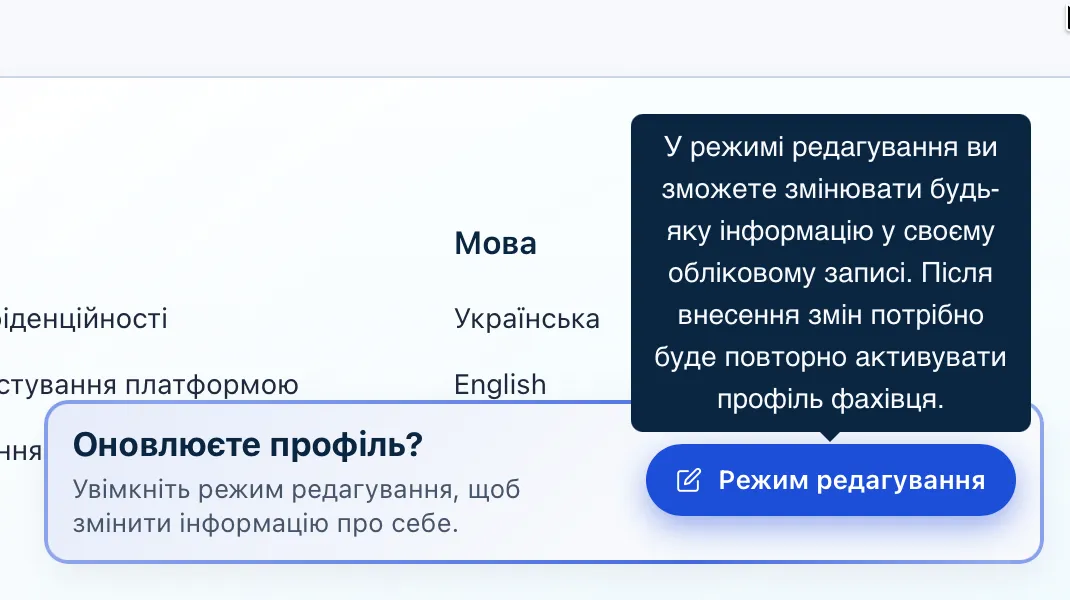 Щоб внести зміни у свій профіль, перейдіть у режим редагування. У меню оберіть Мій профіль та натисніть кнопку Режим редагування на віджеті в правому нижньому кутку. Після цього вам буде доступно змінювати всю інформацію про себе (фото, спеціалізацію, контакти та опис). Після внесених змін, щоб профіль відображався в каталозі фахівців, потрібно знову активувати його.